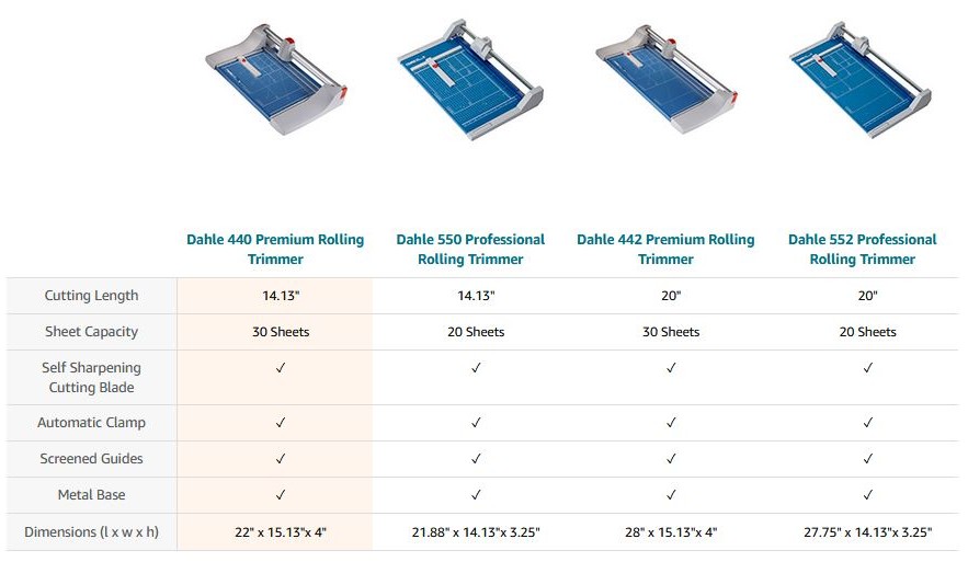 The Dahle 440 Premium Rolling Trimmer with a 14” cutting length is designed for precision trimming of thicker material. It features a ground self-sharpening blade, an extruded aluminum guide bar for strength, and an automatic clamp to prevent shifting. This German engineered cutter is ultra-precise and ideal for trimming paper, cardstock, and matboard.