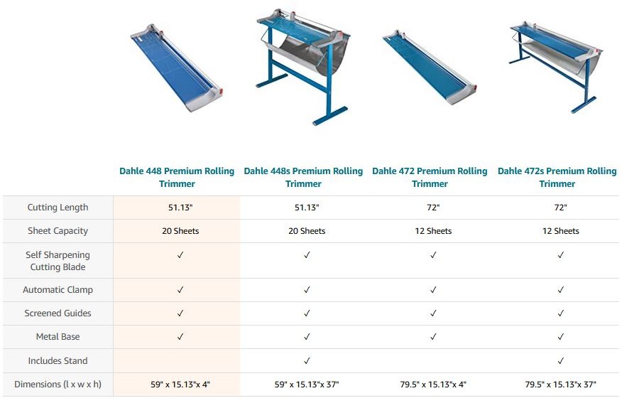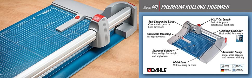 The Dahle 448 Premium Rolling Trimmer with a 51” cutting length is designed for precision trimming of thicker material. It features a ground self-sharpening blade, an extruded aluminum guide bar for strength, and an automatic clamp to prevent shifting. This German engineered cutter is ultra-precise and ideal for trimming paper, cardstock, and matboard.