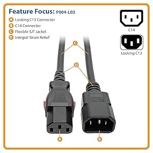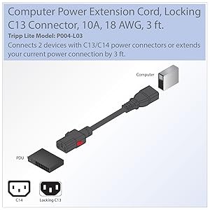 Having a cable come loose accidentally can mean the loss of power and costly downtime. The P004-L03’s locking C13 connector helps you avoid such danger, protecting critical equipment by maintaining a secure link without failure. The locking cable is also invaluable when moving equipment in a rack or removing equipment from tight areas, ensuring the power cord always stays connected.