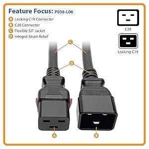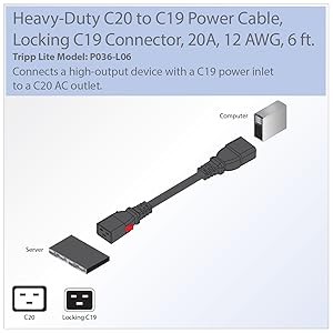 Having a cable come loose accidentally can mean the loss of power and costly downtime. The P036-L06’s locking C19 connector helps you avoid such danger, protecting critical equipment by maintaining a secure link without failure. The locking cable is also invaluable when moving equipment in a rack or removing equipment from tight areas, ensuring the power cord always stays connected.