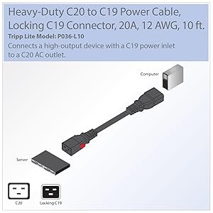 Tripp Lite’s P036-L10 heavy-duty extension cord features 12 AWG wire suitable for high power connections, making it a reliable solution for large server applications that require a higher-rated, heavier-gauge cable. This cord can be used to connect a server, router, network switch or blade server enclosure to a UPS system or PDU. It can also replace or upgrade the standard power cord provided by the device’s manufacturer. The 10-foot length allows you great flexibility in placing equipment with respect to the power outlet.