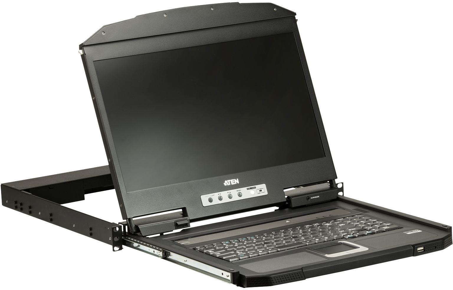 The CL3100 USB VGA LCD Console is a short depth single rail LCD KVM console featuring an 18.5" LED-backlit widescreen LCD monitor with an integrated keyboard and touchpad. The short-depth design fits all 19" equipment cabinets, and is especially suitable for shallow racks. The CL3100 provides an ideal space-saving solution for special environments such as outside broadcast vans (OB vans) and compact control rooms.