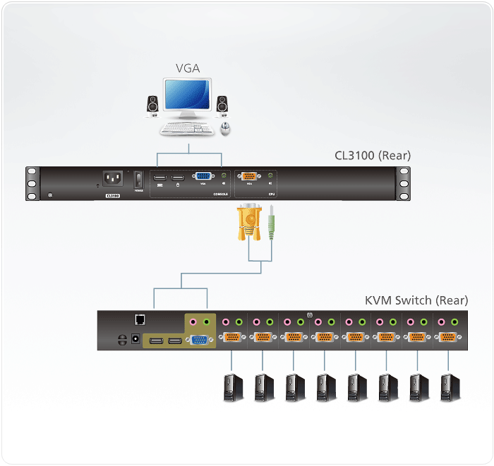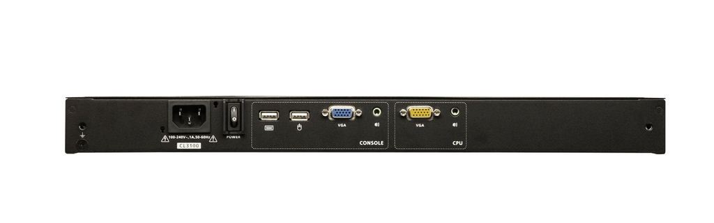The CL3100 is a dedicated front end sliding console for compatible VGA KVM switches. For added convenience, users can choose to manage the computer from an external console. The CL3100 features a port for an external USB mouse on the unit’s front panel, while ports for the second KVM console (USB keyboard/mouse and VGA monitor) are provided on the rear panel. The CL3100 also includes two mini stereo ports for connecting audio speakers.