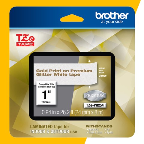 Brother Genuine P-touch TZe-PR254 Gold Print on Premium Glitter White Laminated Tape is 24mm (0.94”) wide x 8m (26.2’)long and designed to let you add sparkle and pizazz to retail shop,craft-based, home and office labels to make them really stand out. P-touch TZe Premium Glitter laminated tapes are made with glitter particles under lamination that add a special sparkle and iridescence to your labels and are ideal for use with a new selection of retail-focused templates available in the Brother Design&Print App (1). Use P-touch TZe Premium Glitter Tapes to create stunning name badges, attractive retail shop, craft, home and office organization labels. They also add a touch of elegance to gifts and gift-wrapping to help make your products and projects shine.
