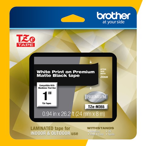 Brother Genuine P-touch TZe-M355 White Print on Premium Matte Black laminated tape is 24mm (0.94”) wide x 8m (26.2’)long and designed to give labels, a finished, polished, and custom look.Premium Matte laminated tape is ideal for retail shops, craft-based businesses,hand-made gifts and gift wrap, home offices and small businesses that want to easily create a sophisticated, refined and coordinated look. P-touch TZe Premium Matte tape adds a special look to your labels and is ideal for use with a new selection of retail-focused templates available in the Brother Design&Print app (1). Use P-touch TZe Premium Matte tapes to create name badges, attractive retail shop, craft, home and office organization labels.They also add a touch of sophistication to gifts and gift-wrapping to help make your products and projects stand out.