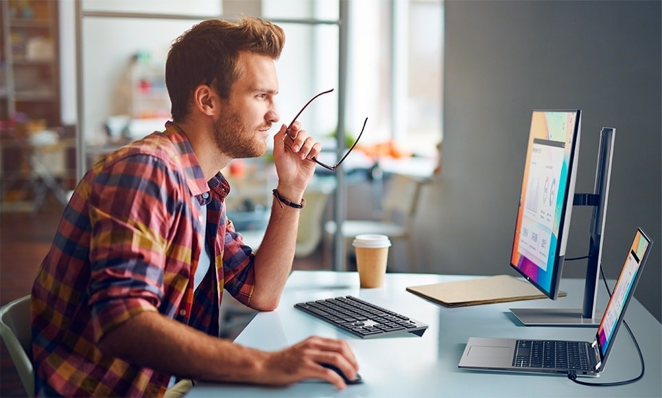 Expand your efficiency: The virtually borderless design featuring InfinityEdge lets you enjoy a nearly seamless view of your content across multiple monitors. And, with dual monitors, you can increase your productivity by up to 18%.
