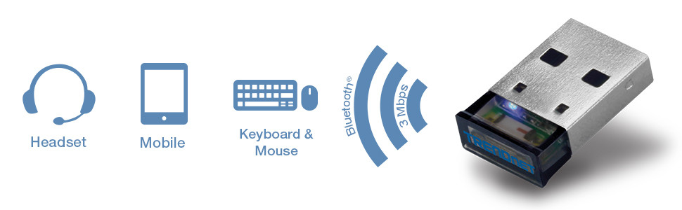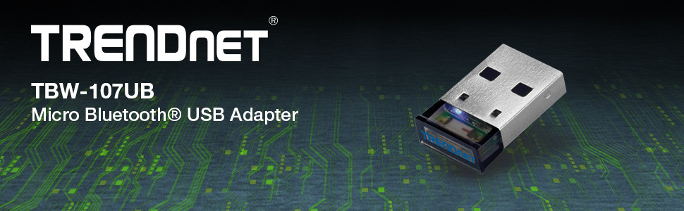 TRENDnet's Micro Bluetooth® USB Adapter, Model TBW-107UB, networks a Windows® computer to Bluetooth® devices such as keyboards, headsets, and mobile devices. Slightly larger than the size of a penny, experience exceptional Bluetooth® connectivity for distances of up to 10 m (33 ft.) with stereo audio support.