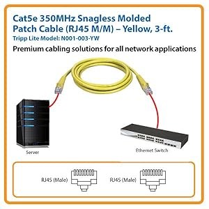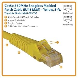 For peace of mind, this three-foot Tripp Lite Cat5e 350MHz Snagless Molded Patch Cable comes backed by a lifetime warranty. The N001-003-YW is manufactured in compliance with strict RoHS specifications, reflecting Tripp Lite’s commitment to environmental responsibility.