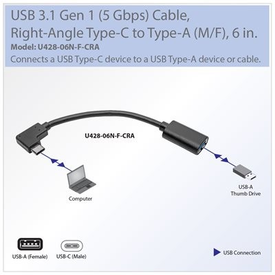 By powering and connecting different USB devices, Tripp Lite’s U428-06N-F-CRA USB Type-C™ (USB-C™) to USB-A, 3.1, Gen 1 cable helps you manage your computers and peripherals efficiently. This black, 6 in. cable with a right-angle USB-C/Thunderbolt™ 3 (M) connector and a USB-A (F) connector supports data transfer rates up to 5 Gbps and provides power output up to 3 amps (60 watts), more than sufficient for charging, syncing and powering compatible devices.