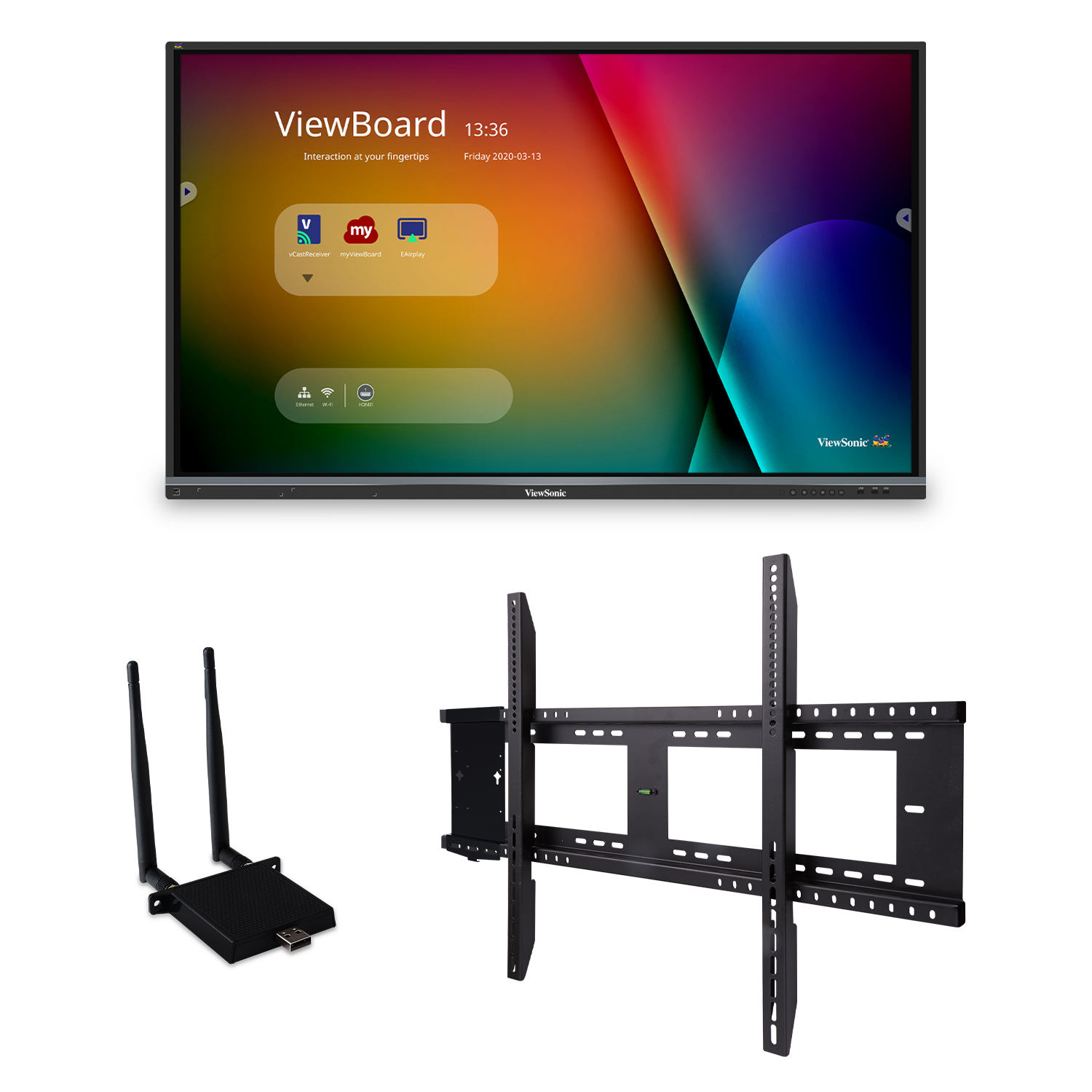 Perfect for education environments, this ViewBoard bundle delivers the most useful items classrooms need to get up and running with their ViewBoard display. You can quickly install the ViewBoard display with the included wall mount, while the included plug-in module provides fast wireless internet connection.