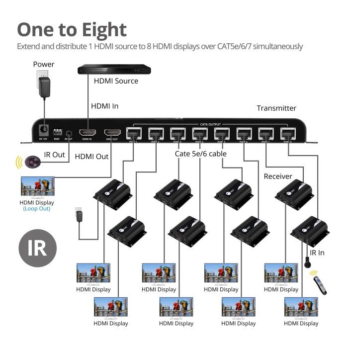 8-Port HDMI Splitter Over Cat6 Extender with IR - 40M
