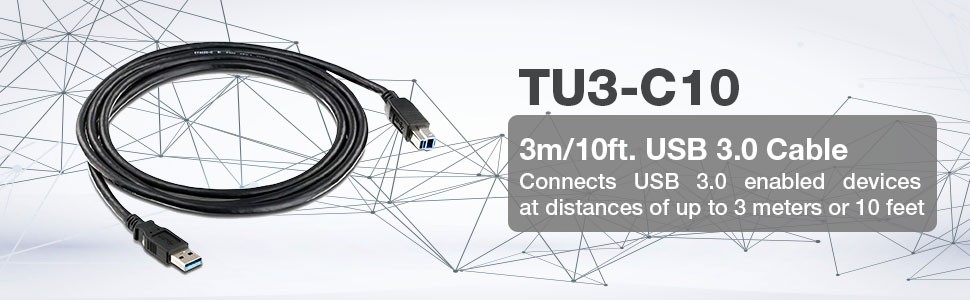 USB 3.0 cable with one type A male connector and one type B male connector. Length: 10 feet. (10.2 ft) Supports data transfer rates up to 5 Gbps USB 3.0 Type-A male connector compatible with USB 2.0, 1.1 and 1.0 ports
