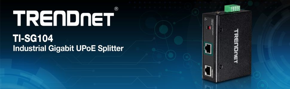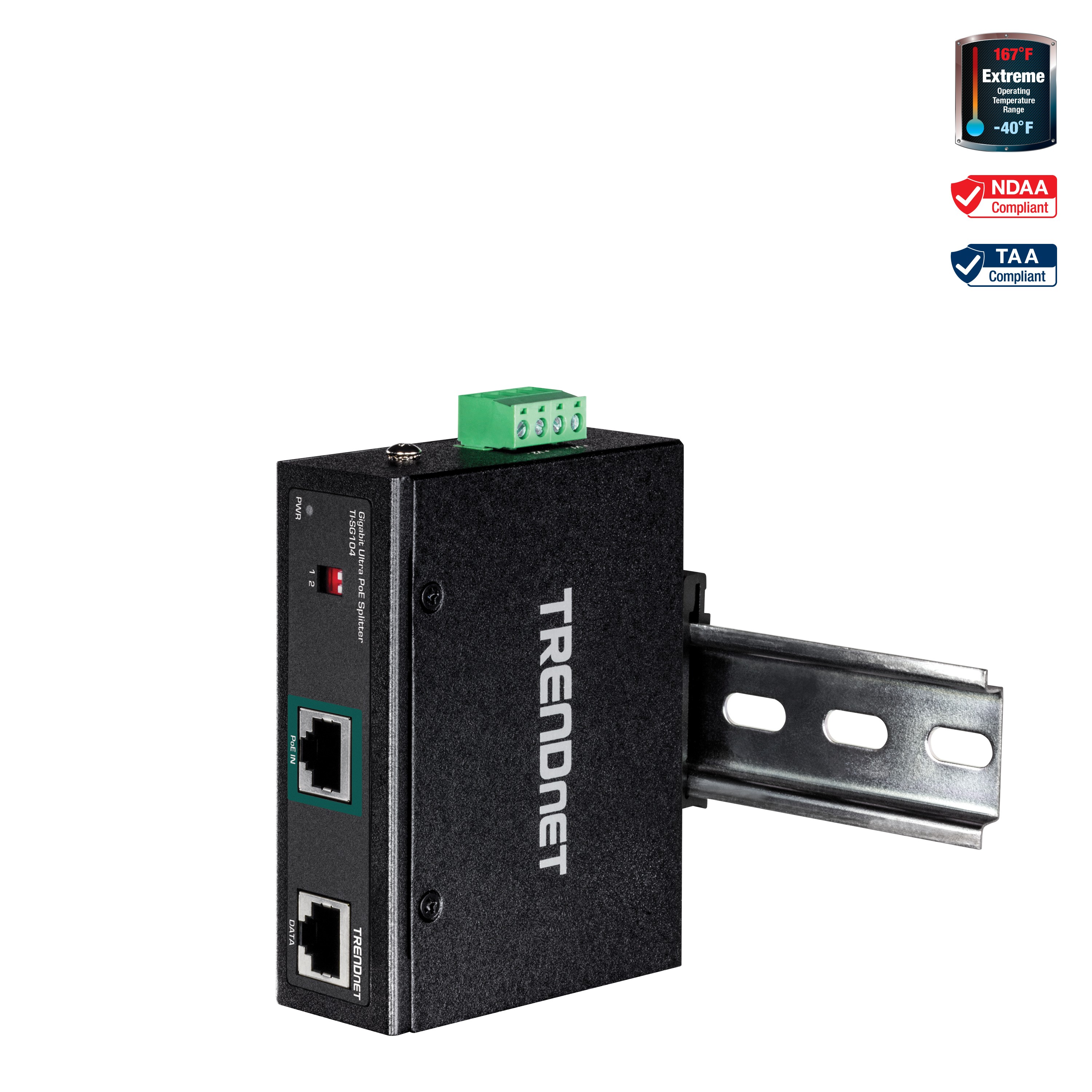 TRENDnet’s Industrial Gigabit UPoE Splitter, model TI-SG104, networks a non-PoE device by using a Gigabit Ultra PoE connection and splitting it into separate power and gigabit data sources. The industrial gigabit UPoE splitter can power to up to two devices from a single UPoE source. A convenient DIP switch adjusts output power to 12V, 16V, 24V, or 48V in order to match power requirements for non-PoE devices. The UPoE splitter’s dual DC power output provides greater device compatibility