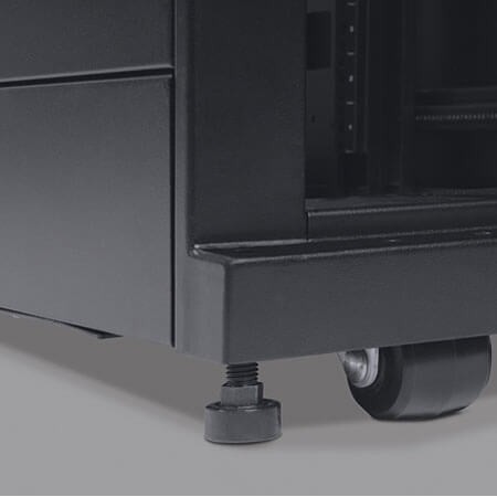 To simplify deployment, the SR42UBDPWD comes with preinstalled casters and leveling feet. The casters allow the SR42UBDPWD to be easily maneuvered into the desired location, where it can then be secured in place by adjusting the leveling feet. The SR42UBDPWD has a rolling load capacity of 2250 lbs., enabling rack equipment to be installed in the enclosure cabinet prior to final deployment. Note: The casters are intended for minor position adjustments within the final installation area only and are not designed for moving the enclosure cabinet over long distances.