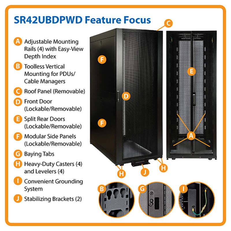The SR42UBDPWD’s massive front-to-rear ventilation capacity meets or exceeds server manufacturer requirements and offers full compatibility with a wide range of airflow optimization accessories and cable management accessories. Its integrated baying tabs make it easy to combine multiple enclosure cabinets in row-based data centers. The SR42UBDPWD offers guaranteed compatibility with all EIA-310-E compliant 19-in. equipment, and is also 100% compatible with today's state-of-the-art hot-aisle/cold-aisle data center configurations.