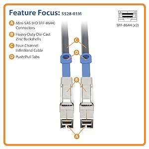 Tripp Lite’s one-meter S528-01M Mini-SAS HD Cable connects two hard drives or storage area network (SAN) devices to consolidate and share data in small- to medium-size organizations. It’s compatible with any storage device with HD SFF-8644 connectors, such as 12G RAID controllers, SATA hard drives, enclosures and JBOD arrays. For flexibility and convenience, it’s also backward compatible with previous SAS generations.
