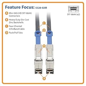 Tripp Lite’s two-meter S528-02M Mini-SAS HD Cable connects two hard drives or storage area network (SAN) devices to consolidate and share data in small- to medium-size organizations. It’s compatible with any storage device with HD SFF-8644 connectors, such as 12G RAID controllers, SATA hard drives, enclosures and JBOD arrays. For flexibility and convenience, it’s also backward compatible with previous SAS generations.