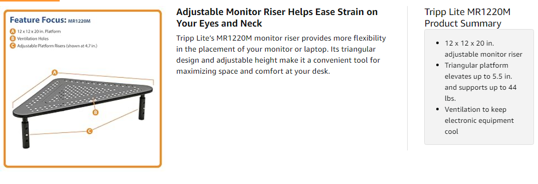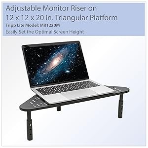The MR1220M’s 12 x 12 x 20 in. platform supports devices weighing up to 44 lbs., such as monitors, laptops, printers and small televisions. Through elevation, it can also help protect electronic equipment in environments where water, sawdust and other contaminants are more prevalent on desk surfaces.