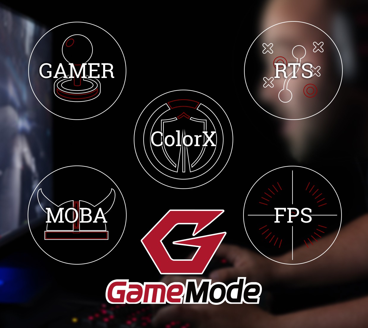 A Game Mode function opens pre-calibrated FPS 1, FPS 2, RTS, and MOBA settings that deliver the best blend of color and technology for specific gaming scenarios.