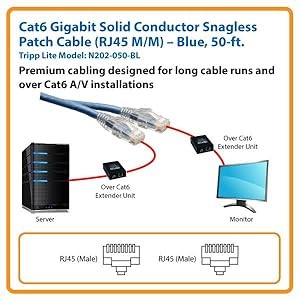 This 50-foot Tripp Lite Cat6 Gigabit Solid Conductor Snagless Patch Cable is the premium solution for connecting network components like computers, printers, Internet-enabled gaming systems and Blu-ray players, copy machines, routers and modems over longer distances. It’s made of solid conductor wire for a lower DC resistance than stranded conductor wire, allowing signals to run farther while maintaining signal strength.