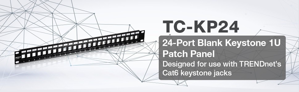 TRENDnet’s 24-Port Blank Keystone 1U Patch Panel, model TC-KP24, is designed for use with TRENDnet’s Cat6 keystone jacks (TC-K25C6 and TC-K50C6). When used together, they create a patch panel solution suitable for gigabit and 10G Copper Ethernet network applications.