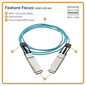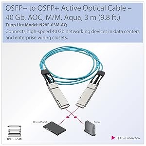 Tripp Lite’s N28F-03M-AQ QSFP+ fiber cable (M/M) combines four full-duplex 10 Gbps SFP+ channels into one affordable high-density package to deliver next-generation performance. The male connectors feature four fiber optic transceivers apiece, each capable of data transfer speeds up to 10 Gbps. Together, this active optical cable (AOC) provides an aggregated speed up to 40 Gbps, making it ideal for switches, servers, routers and other high-end networking devices in your data center or enterprise wiring closet.