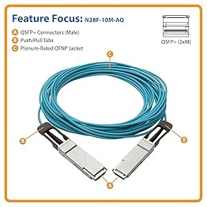 Tripp Lite’s N28F-15M-AQ QSFP+ fiber cable (M/M) combines four full-duplex 10 Gbps SFP+ channels into one affordable high-density package to deliver next-generation performance. The male connectors feature four fiber optic transceivers apiece, each capable of data transfer speeds up to 10 Gbps. Together, this active optical cable (AOC) provides an aggregated speed up to 40 Gbps, making it ideal for switches, servers, routers and other high-end networking devices in your data center or enterprise wiring closet.
