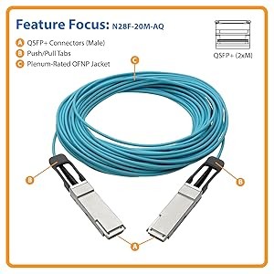 Tripp Lite’s N28F-20M-AQ QSFP+ fiber cable (M/M) combines four full-duplex 10 Gbps SFP+ channels into one affordable high-density package to deliver next-generation performance. The male connectors feature four fiber optic transceivers apiece, each capable of data transfer speeds up to 10 Gbps. Together, this active optical cable (AOC) provides an aggregated speed up to 40 Gbps, making it ideal for switches, servers, routers and other high-end networking devices in your data center or enterprise wiring closet.