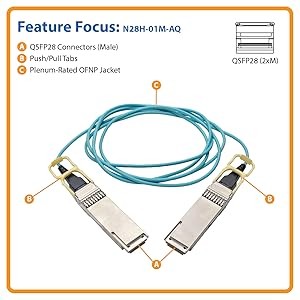 Tripp Lite’s N28H-01M-AQ QSFP28 fiber cable (M/M) combines four full-duplex 25 Gbps SFP channels into one affordable high-density package to deliver next-generation performance. The male connectors feature four independent 850 nm VCSEL-based transmitters and four independent receivers using PIN photo detectors, with each lane capable of data transfer speeds up to 25 Gbps. Together, this active optical cable (AOC) provides an aggregated speed up to 100 Gbps, making it ideal for switches, servers, routers and other high-end networking devices in your data center or enterprise wiring closet.