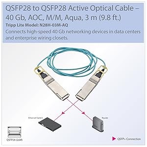 Tripp Lite’s N28H-03M-AQ QSFP28 fiber cable (M/M) combines four full-duplex 25 Gbps SFP channels into one affordable high-density package to deliver next-generation performance. The male connectors feature four independent 850 nm VCSEL-based transmitters and four independent receivers using PIN photo detectors, with each lane capable of data transfer speeds up to 25 Gbps. Together, this active optical cable (AOC) provides an aggregated speed up to 100 Gbps, making it ideal for switches, servers, routers and other high-end networking devices in your data center or enterprise wiring closet.