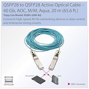 Tripp Lite’s N28H-20M-AQ QSFP28 fiber cable (M/M) combines four full-duplex 25 Gbps SFP channels into one affordable high-density package to deliver next-generation performance. The male connectors feature four independent 850 nm VCSEL-based transmitters and four independent receivers using PIN photo detectors, with each lane capable of data transfer speeds up to 25 Gbps. Together, this active optical cable (AOC) provides an aggregated speed up to 100 Gbps, making it ideal for switches, servers, routers and other high-end networking devices in your data center or enterprise wiring closet.