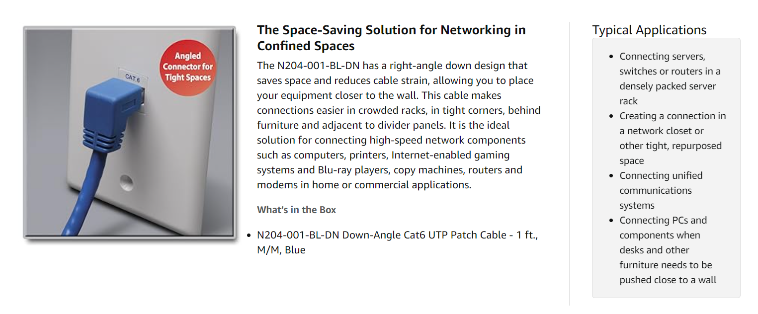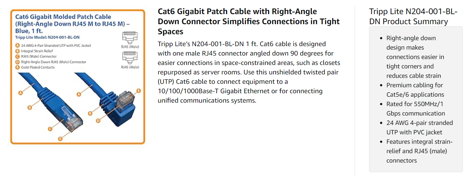 Manufactured from 24 AWG 4-pair stranded UTP, the N204-001-BL-DN provides high-speed connections and flawless signal delivery while keeping near-end crosstalk levels to a minimum. This cable can deliver speeds up to 550MHz/1 Gbps. Both of its male RJ45 connectors are gold-plated to ensure accurate signal transfer. The cable has a blue PVC jacket for color-coding and fast identification, with molded integral strain-relief that provides flexibility for a secure connection.