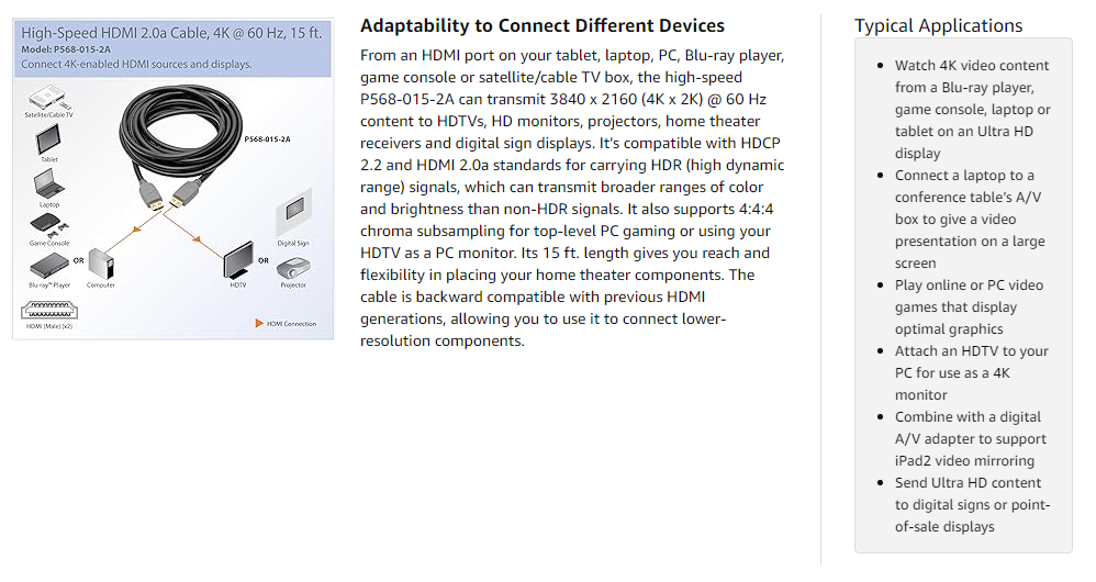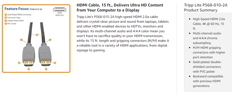 The P568-015-2A’s specially-designed high-grip plugs have greater port retention than typical HDMI connectors, helping them resist the vibrations that can loosen them over time. This will keep your presentations, games and movies safer from signal disruptions - especially important when the cable is in a difficult-to-access location. The grippers also protect against accidental disconnection from tripping or other contact that might happen in high-traffic locations like trade show floors or retail spaces.