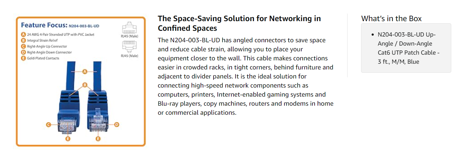Manufactured from 24 AWG 4-pair stranded UTP, the N204-003-BL-UD provides high-speed connections and flawless signal delivery while keeping near-end crosstalk levels to a minimum. This cable can deliver speeds up to 550MHz/1 Gbps. Both of its male RJ45 connectors are gold-plated to ensure accurate signal transfer. The cable has a blue PVC jacket for color-coding and fast identification, with molded integral strain-relief that provides flexibility for a secure connection.