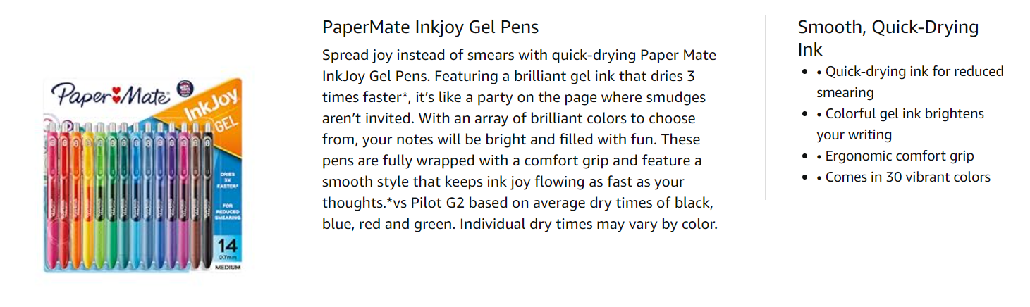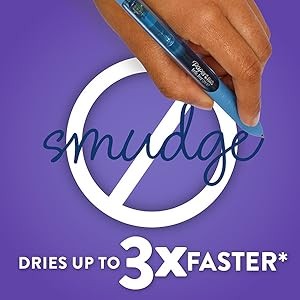Dries Up to 3x Faster*Paper Mate InkJoy pens feature smooth gel ink that dries 3 times faster*! With the fast-drying ink, you can focus on your thoughts and forget about smudges.*vs Pilot G2 based on average dry times of black, blue, red and green. Individual dry times may vary by color. |