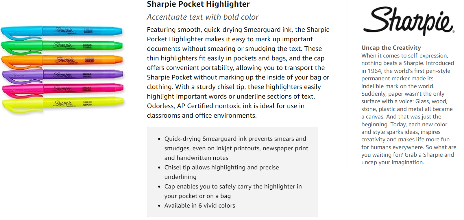 Easy highlighting is just a click away with the Sharpie Retractable Highlighter, which offers single-handed convenience with a capless, click-and-go design. Take notes and finish school readings with the integrated pen clip, and prevent smudging with quick-drying Smearguard ink.