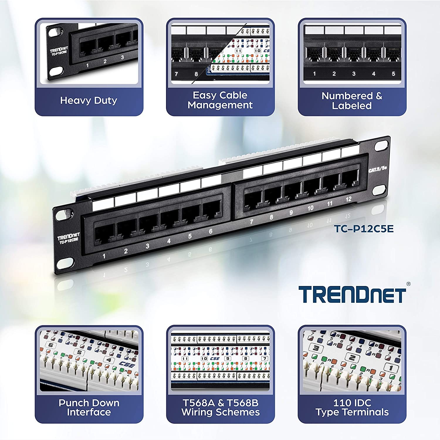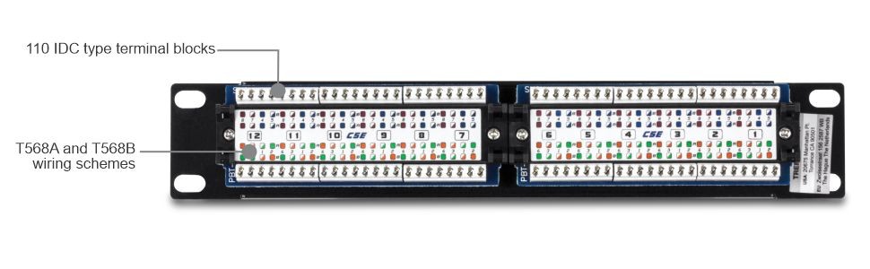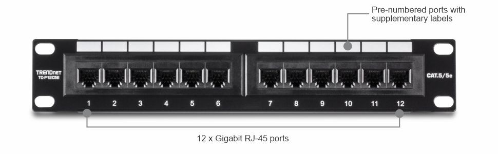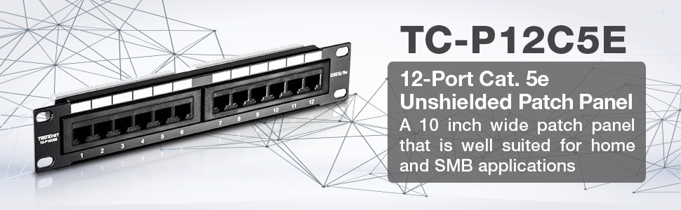 The 12-port jack. 5e Unshielded Patch Panel, provides a 100 MHz connection to 12 Gigabit RJ-45 Ethernet ports. This 10 '' wide patch panel is well suited for home and small to medium business applications. Control cable clutter with removable brackets and included cable ties. A writing surface on each port allows users to label the respective connections. Use with TRENDnet's Punch Down Tool with 110 and Krone Blade, Model TC-PDT and RJ-11 / RJ-45 Crimp / Cut / Strip Tool, Model TC-CT68.