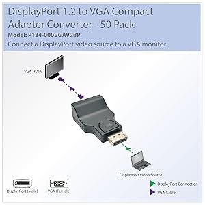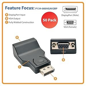 Bulk pack includes 50 Tripp Lite P134-000-VGA-V2 DisplayPort to VGA active adapters (M/F). Each molded one-piece unit enables you to connect a VGA monitor, projector or television to the DisplayPort 1.2 output on your PC, Mac, Chromebook, MacBook, Microsoft Surface or other compatible computer or tablet. You can continue to use your existing VGA display and VGA cable to watch high-definition video without the expense of a new DisplayPort monitor. These adapters are backward compatible with pre-1.2 DisplayPort generations.