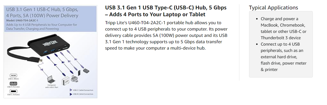 Plug the U460-T04-2A2C-1 into a USB-C or Thunderbolt 3 port on your tablet, laptop, notebook, MacBook, Chromebook, smartphone or PC. Its 2 USB-A ports are ideal for connecting an external hard drive or printer for fast 5 Gbps data transfer speed (10 times faster than USB 2.0). Connect USB-C devices like smartphones to the hub’s USB-C data port for the same 5 Gbps speed. You can also connect your computer’s AC wall charger to the hub’s USB-C Power Delivery port for power output up to 5A (100W), which is more than adequate for charging and powering it.