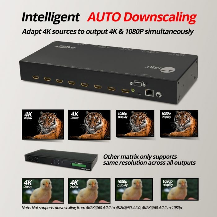 Supports 4Kx2K to 1080p resolution down scaling, down scaling feature detects and configures the video resolution automatically according to the capabilities of each connected monitor. Allows simultaneous 4K and 1080P output. Supports simultaneous mixed 4K and 1080p display outputs. *See Notes below for limitations