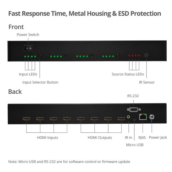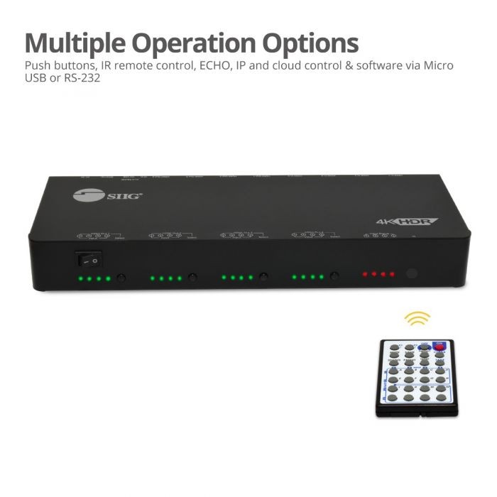 Easily switch between HDMI source and display using push button, IR remote control, RS-232, and Ethernet control and cloud control