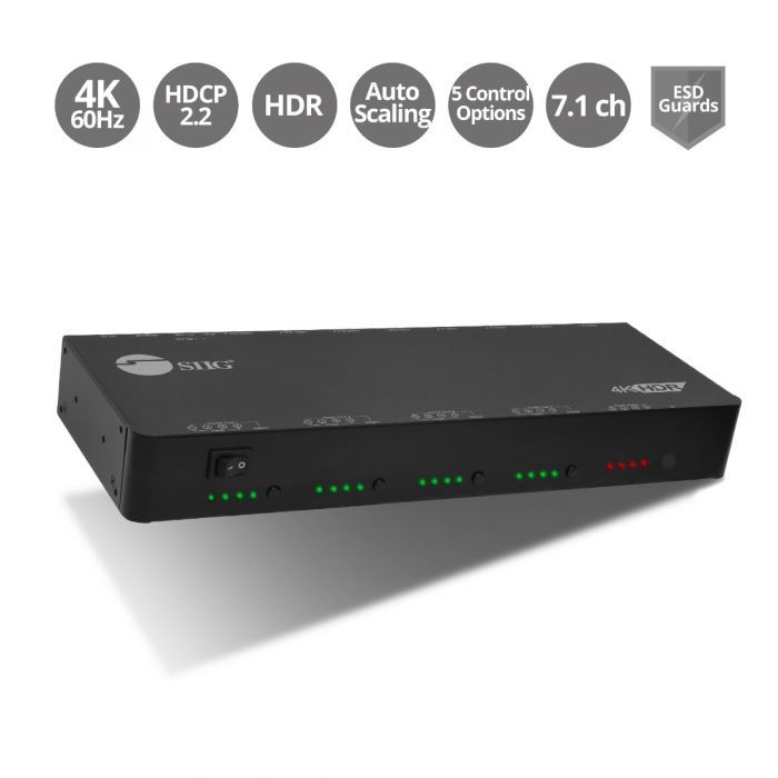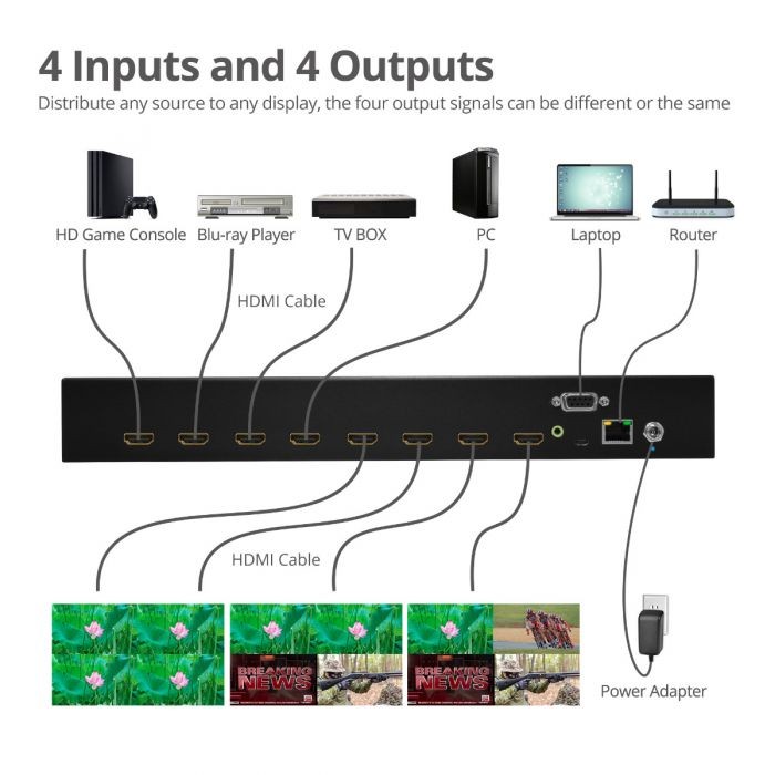 Allows you to select and switch between any of the 4 HDMI source devices to display on any of the 4 HDMI displays simultaneously