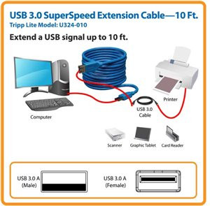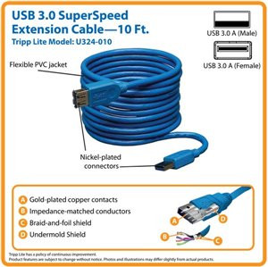 Don't settle for inferior workmanship or performance! This Tripp Lite USB 3.0 SuperSpeed Extension Cable assures that you get maximum performance from USB devices over long distances. Unlike cut-price cables, the U324-010 is manufactured to exacting specifications, using superior materials, to deliver full USB 3.0 performance for multimedia and other high-end applications.