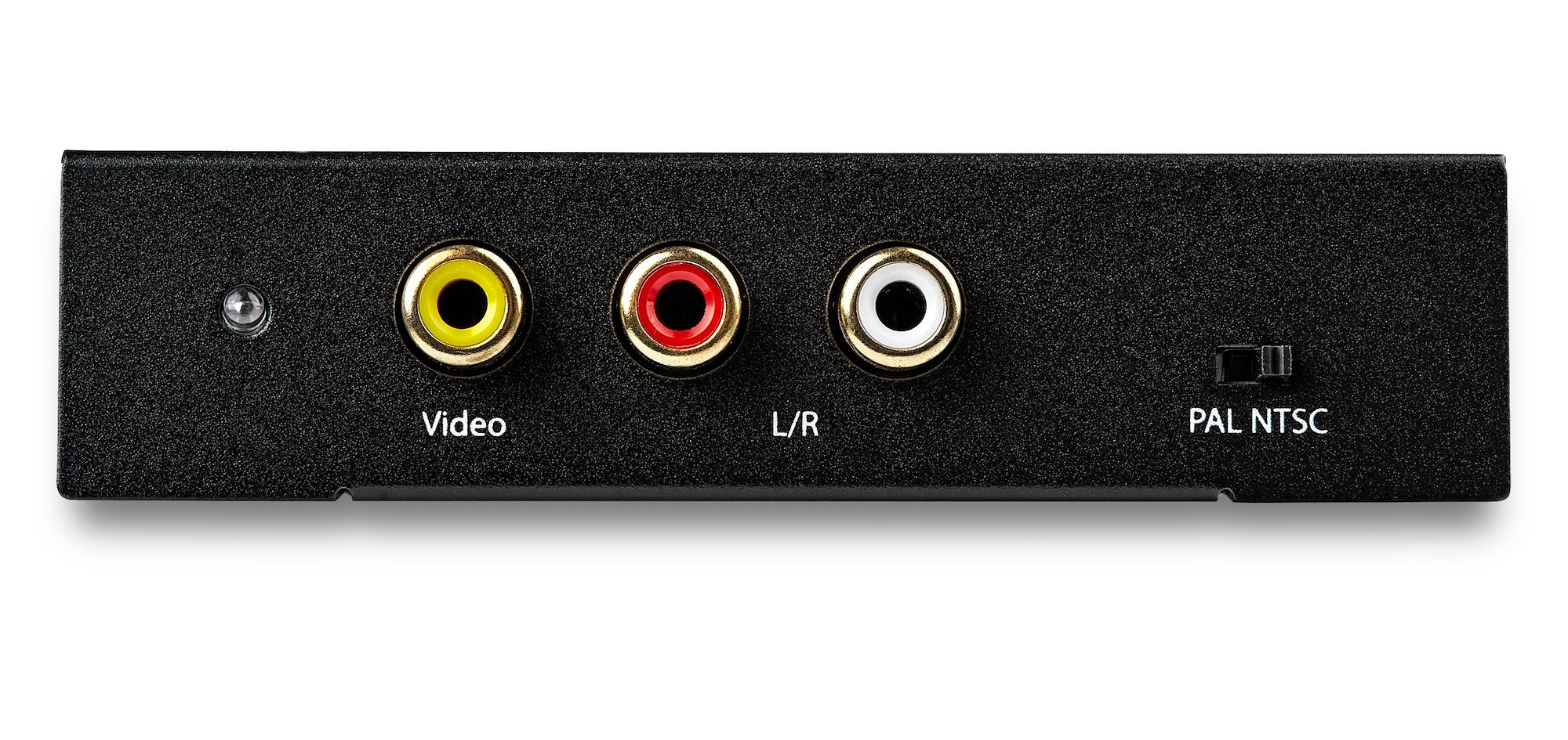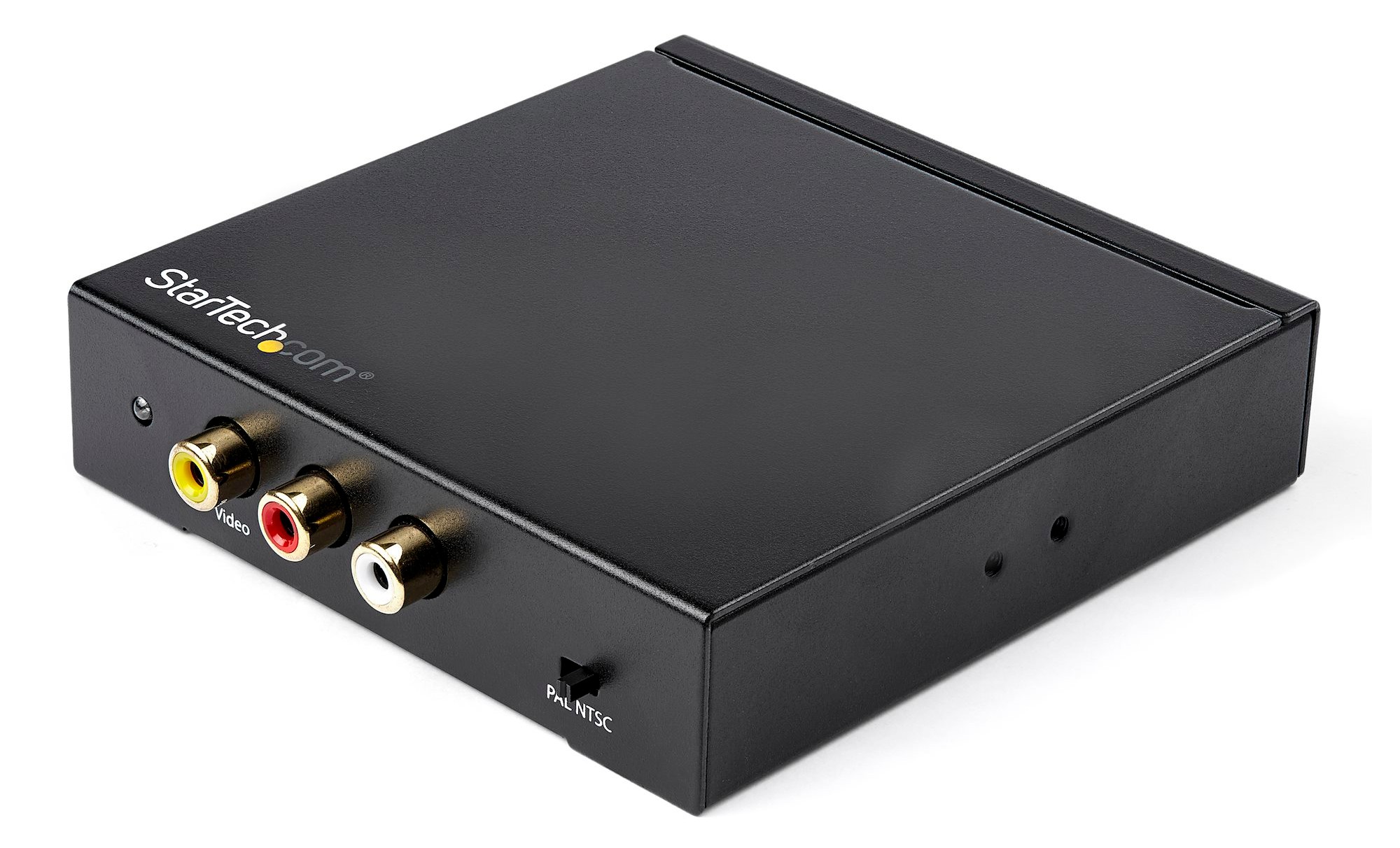 This HDMI to RCA converter box with audio converts a digital HDMI video source (with supporting audio) to work with analog RCA composite video televisions and displays, in both NTSC and PAL systems.