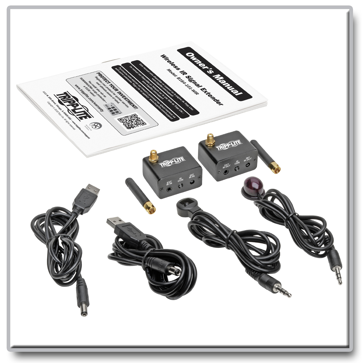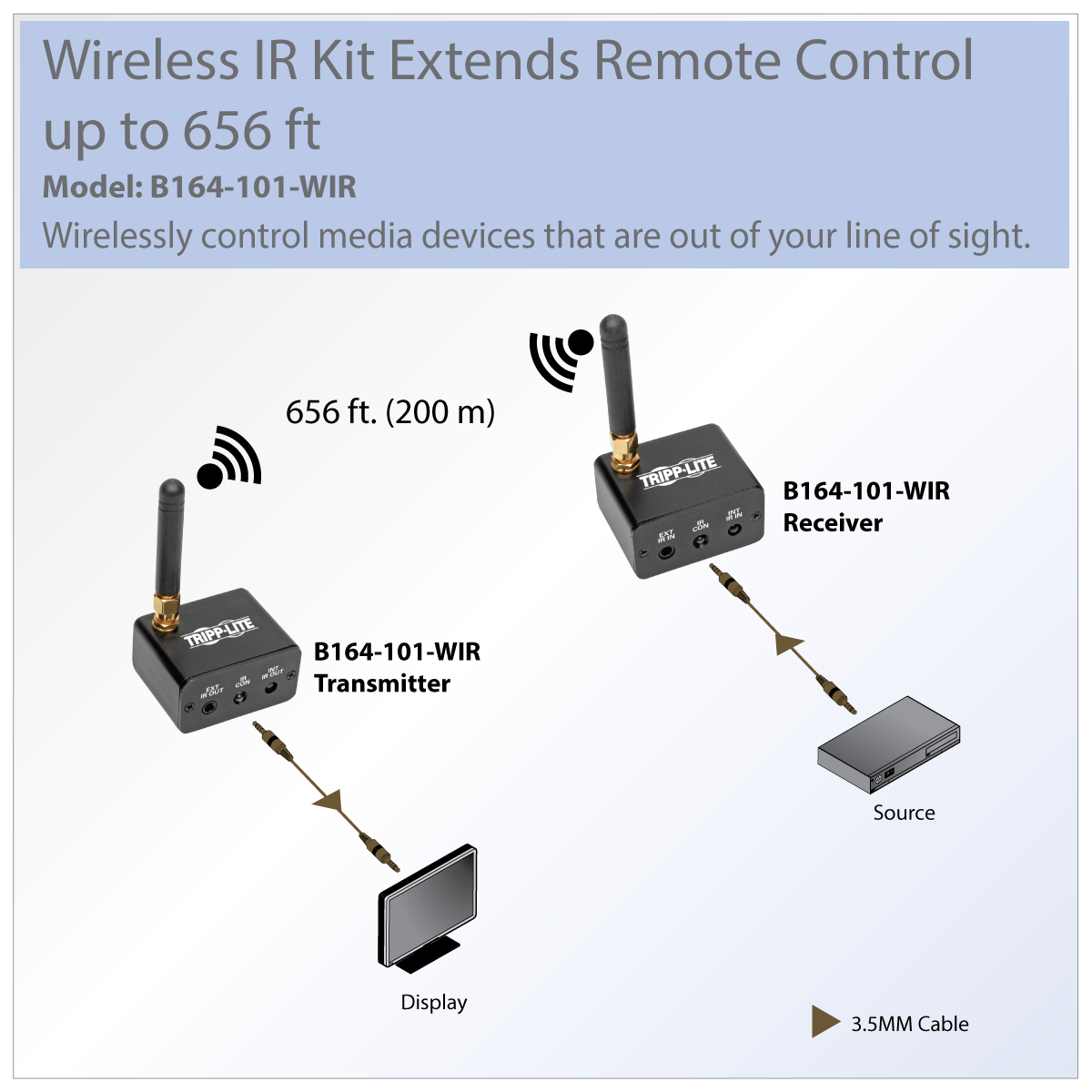 Tripp Lite’s B164-101-WIR kit extends your wireless remote control of media devices like DVD or Blu-ray players, stereos and cable boxes up to 656 ft. (200 m). This complete wireless IR transmitter and receiver system’s pass through technology allows you to control speakers or a display with zero latency, even when the source device (e.g. the stereo or DVD player) is separated over a significant distance and/or out of sight, making it ideal for large-scale audio/video presentations and outdoor media applications.