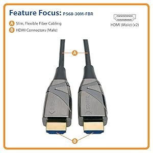 This 4K-capable cable securely connects HDMI-enabled laptops, tablets, PCs, Blu-ray players, game consoles or satellite/cable TV boxes to HDTVs, HD monitors, projectors or home theater receivers. Because the P568-30M-FBR uses optical fiber, it can transmit HDMI signals longer distances with no latency or loss. It also eliminates any EMI/RFI line noise that can interfere with your audio/video signal and disrupt the performance of your connected equipment.