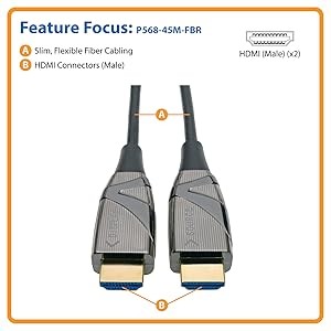 This 4K-capable cable securely connects HDMI-enabled laptops, tablets, PCs, Blu-ray players, game consoles or satellite/cable TV boxes to HDTVs, HD monitors, projectors or home theater receivers. Because the P568-45M-FBR uses optical fiber, it can transmit HDMI signals longer distances with no latency or loss. It also eliminates any EMI/RFI line noise that can interfere with your audio/video signal and disrupt the performance of your connected equipment.