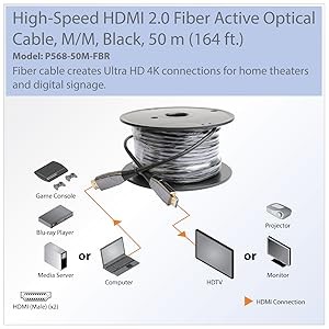 This 4K-capable cable securely connects HDMI-enabled laptops, tablets, PCs, Blu-ray players, game consoles or satellite/cable TV boxes to HDTVs, HD monitors, projectors or home theater receivers. Because the P568-50M-FBR uses optical fiber, it can transmit HDMI signals longer distances with no latency or loss. It also eliminates any EMI/RFI line noise that can interfere with your audio/video signal and disrupt the performance of your connected equipment.