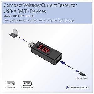 Tripp Lite’s T050-001-USB-A voltage and current tester kit connects to a USB-A female port on a power source device, such as a laptop or charging station. Its other end connects to a USB-A cable and the device you wish to charge. Its LCD screen will inform you of both the source port’s voltage capacity and the amperage that the connected device is drawing so you can reliably monitor the charging of devices. Its black, pocket-size housing and immediate diagnostic reading make it a convenient tool to bring to conferences, tradeshows, hotels and airports for testing charging capabilities of available USB-A ports.