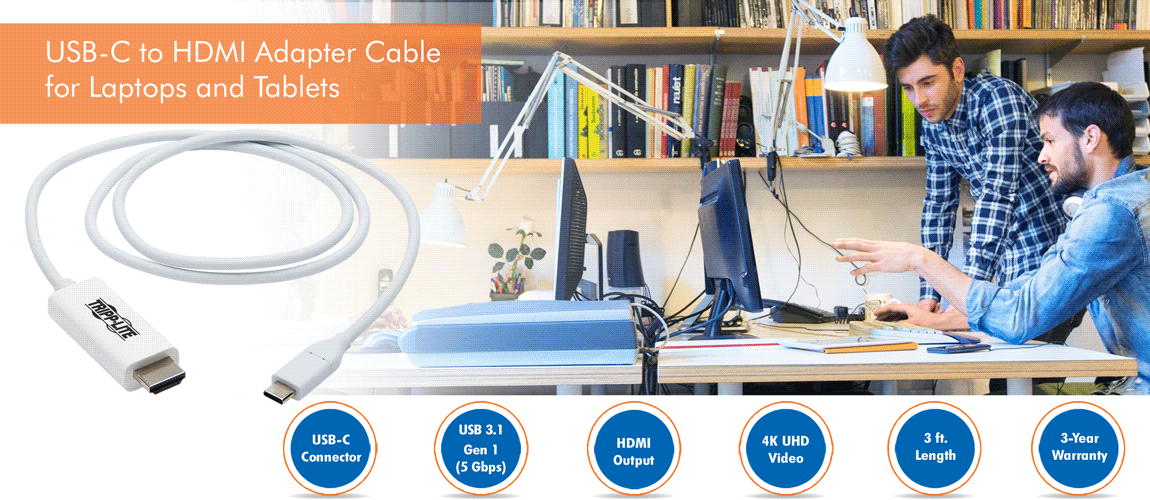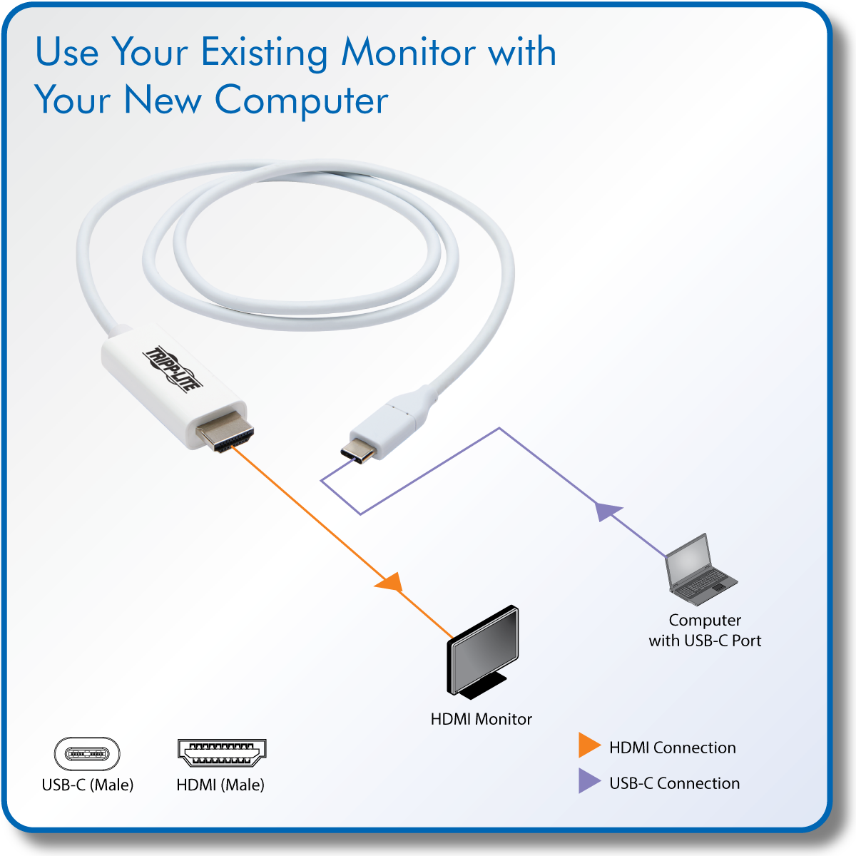 Newer tablets, laptops, Chromebook™ and MacBook® notebooks, desktop computers and even smartphones often have only USB Type-C™ ports for connection to peripherals. This cable directly connects a USB-C™ or Thunderbolt™ 3 port on a video source that supports USB DisplayPort Alternate Mode (Alt Mode) to an HDMI television, monitor or projector.
